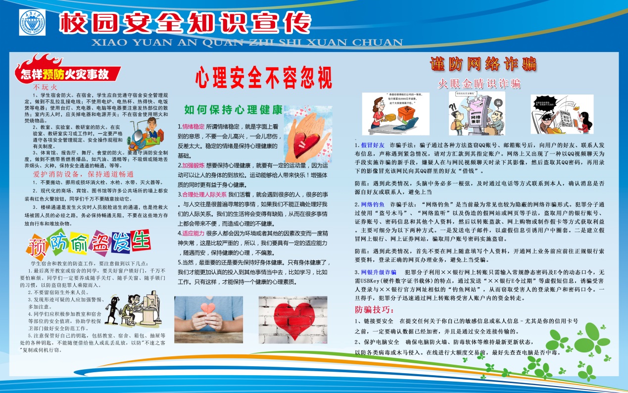 当前,校园安全面临着诸多挑战。结合学校学院实际情况,学院研团委学生会根据宿舍违规使用电器、宿舍被“不速之客”关顾、新生入学适应性不强产生压力、网络诈骗无孔不入等现实情况,聚焦如何防火、防盗,加强心理健康教育和防范网络诈骗等四个与同学们息息相关的校园安全话题,分设板块对各个话题的注意事项进行了详细严谨的阐述,并自制了精美的安全知识手册,打印后于11月19日前分发到每一位研究生。
