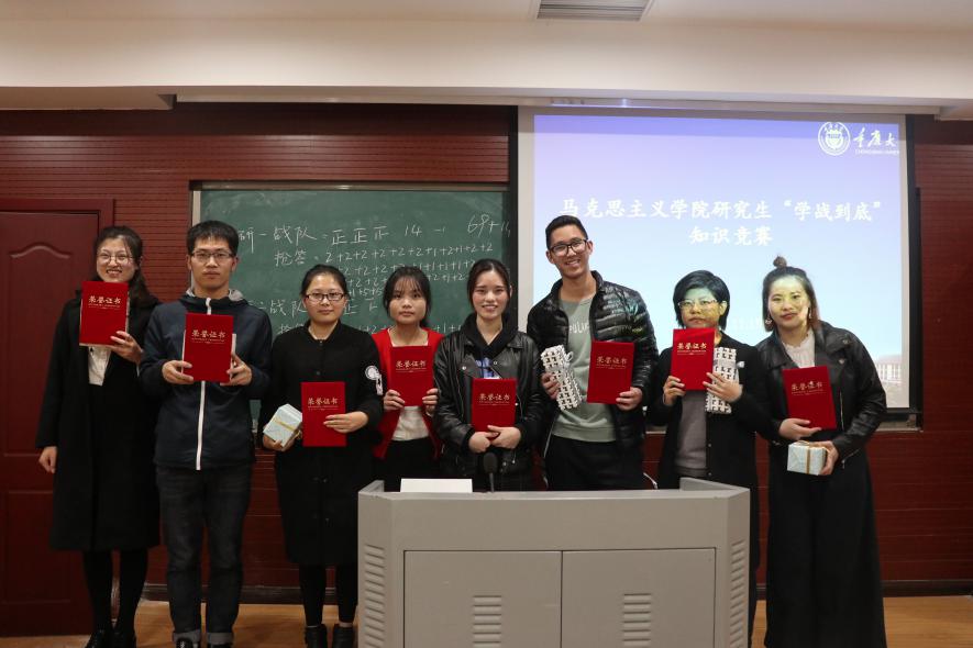 研团委学生会副主席尚杨为研一战队长颁发证书和奖品。赛后获胜同学表示,在接下来的全校知识竞赛中,将再接再厉,努力在更大的舞台上展现马院学子的风采。