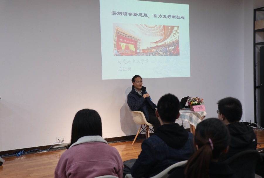 “红岩读书会”漂流队成员的身份参与了电子科大马院承办的“导师讲坛”。电子科大王让新教授作了题为“深刻领会新思想 奋力走好新征程”的报告,王让新教授从十九大报告的主要内容、三大贡献和文本框架展开进行了详细的讲解。王让新教授最后指出,作为学生一定要把十九大精神落到实处,奋力实现中国梦。我院马尚明同学就王让新教授的报告进行了提问,王教授耐心回答了马尚明的问题。