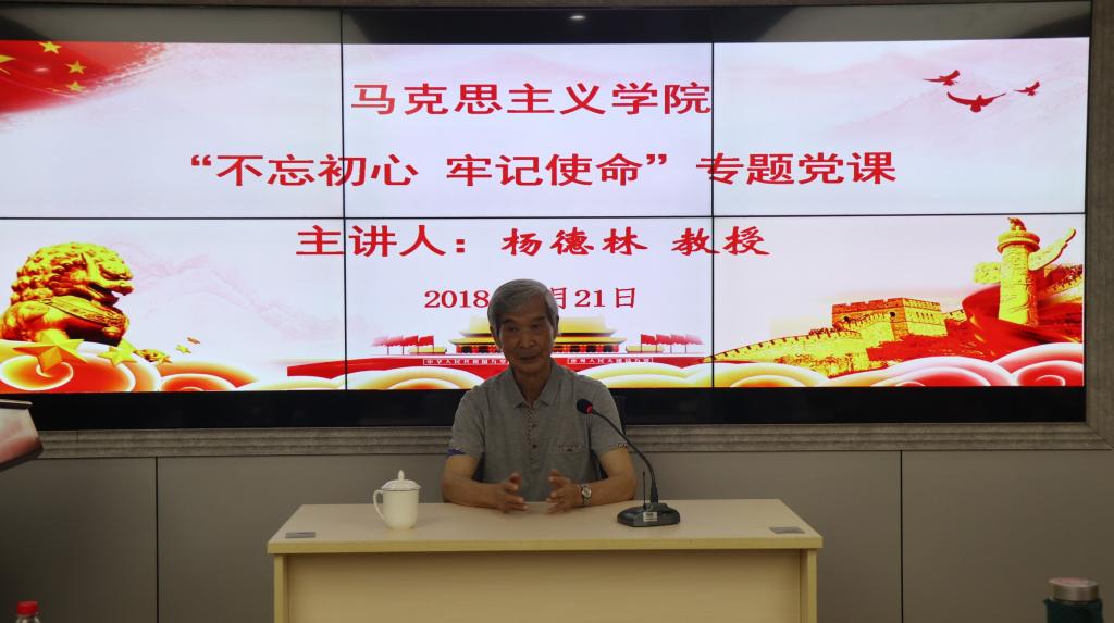 表彰大会结束后,学院特邀离退休老干部毛石灵老师、退休老教授杨德林老师为全院师生党员讲“不忘初心、牢记使命”主题党课。毛老师围绕个人经历和学习习近平总书记系列重要讲话两个方面谈到了自己的入党初心和作为一名共产党人的信仰,即坚定理想、遵守纪律;他告诫广大青年党员要不忘党恩,永远跟党走,要珍惜好时代,理想坚定,为人民服务。杨德林教授谈到参军、求学、入党、工作以来都得到了中国共产党的精心培养,他认为广大党员同志首先必须坚定理想信念,把党的利益放在首位;其次党员同志应该发挥带头模范作用,在所在岗位贡献力量;最后党员同志不仅要研读马列经典,增强党性,还要有实干精神,经世致用,知行合一,将个人理想与中国特色社会主义事业相结合。