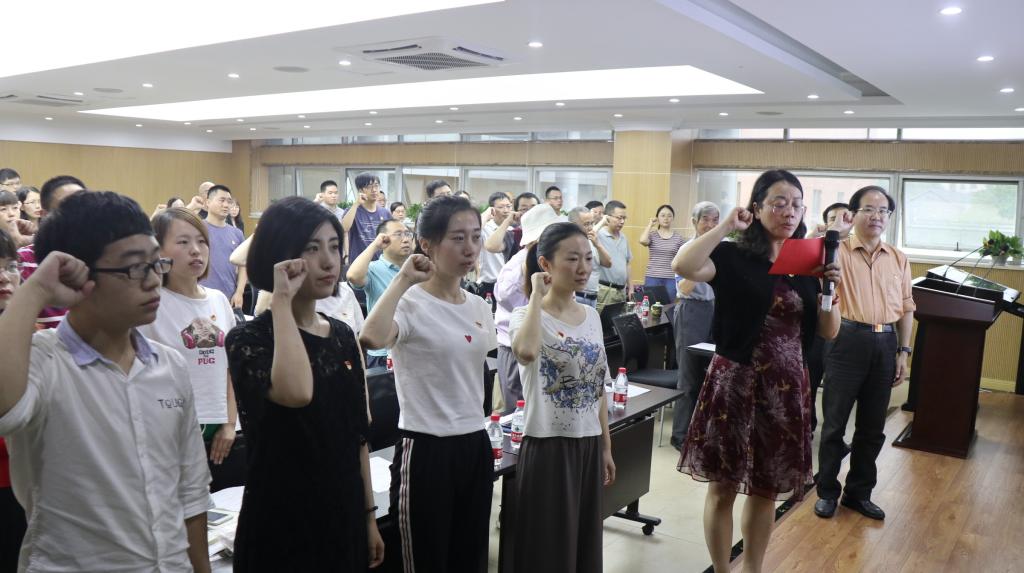 在表彰环节之后,肖铁岩院长、罗滌书记带领学院新党员宣誓,老党员也一起重温了入党誓词。罗书记在接下来的讲话中谈到,“仪式,是为了在庄严中能够永久地铭记。”她说,入党宣誓、奏唱国歌和国际歌这些都是不可少的仪式,入党誓言应该是发自内心的自愿选择,而非“现实需求”;誓言是矢志不渝的人生追求;誓言也是与时俱进的政治宣言,这也就说明誓言是不可更改的庄严承诺。罗书记列举了马院师生在学院发展建设中教师党员们践行入党誓言的点滴故事。最后,她倡导学院师生不仅要用实际行动展现誓言,更要用扎扎实实的本领实现誓言。