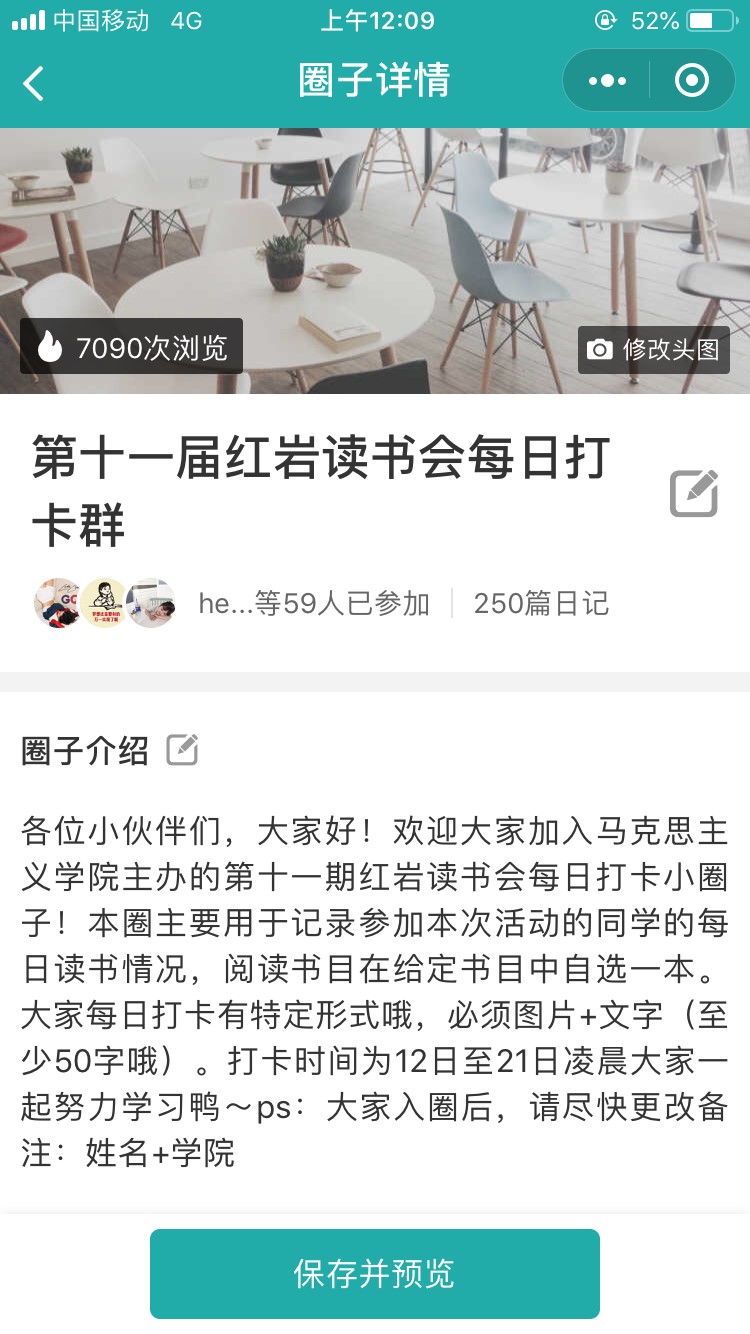 线上活动“十天打卡计划”于2019年3月12日至21日展开,报名参加本期红岩读书会的同学在推荐书目中选取自己感兴趣的书籍,由此组成不同的阅读圈,并通过微信小程序“小打卡”进行每日打卡,交流读书心得。