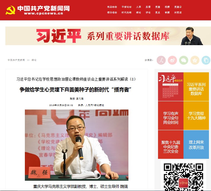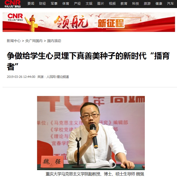 魏强副教授、硕士生廖凡瑶合著的学习解读习近平总书记在学校思想政治理论课教师座谈会上发表的重要讲话的文章《争做给学生心灵埋下真善美种子的新时代“播育者”》入选人民网(//theory.people.com.cn/n1/2019/0326/c40531-30994903.html ),并被中国新闻网(//www.chinanews.com/gn/2019/03-26/8790722.shtml)、中国网(//www.china.com.cn/opinion/theory/2019-03/26/content_74612071.htm)、央广网(//news.cnr.cn/native/gd/20190326/t20190326_524555985.shtml)等多家权威主流媒体转载。