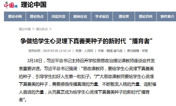 2019年3月18日,中共中央总书记、国家主席、中央军委主席习近平在京主持召开学校思想政治理论课教师座谈会并发表重要讲话。习近平总书记指出,思想政治理论课是落实立德树人根本任务的关键课程,思政课作用不可替代,思政课教师队伍责任重大,并且强调思政课教师要给学生心灵埋下真善美的种子,引导学生扣好人生第一粒扣子。抖音短视频