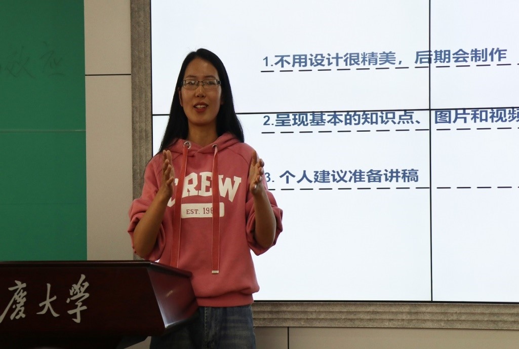 王小凤老师从三个方面就微课录制作详细解读。她认为,在拍摄录制微课时首先应该选择录制的模式,关注录制教室的环境,比如灯光、PPT、讲台的位置等问题;在微课设计上,要注意主题选择、内容设计、资料准备三个方面。具体而言,就是要切实把握好教学方式、教学时长、标题设计、教学导入、课件制作等五个方面,不仅要符合录制规范,而且要突出学科特点和专业特色。随后,王小凤老师就拍摄的注意事项和后期视频制作等问题提出了意见和建议。会后,老师们都纷纷表示受益匪浅,将会做好录制前的充分准备,将微课视频应用到思想政治理论课教育教学中,提高思想政治理论课教学的实效。