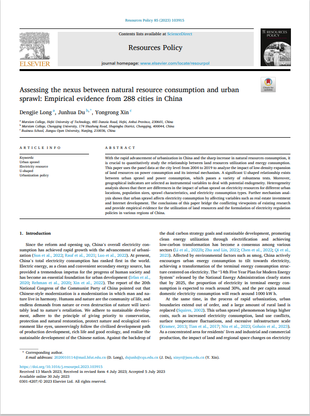 杜俊华教授在SSCI一区期刊《RESOURCE POLICY》2023年第8期上发表论文《Assessing the nexus between natural resource consumption and urban sprawl: Empirical evidence from 288 cities in China》