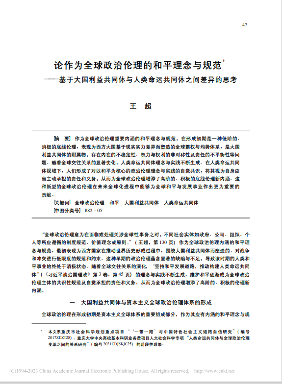 王超副教授在CSSCI核心期刊《哲学动态》上发表论文《论作为全球政治伦理的和平理念与规范——基于大国利益共同体与人类命运共同体之间差异的思考》