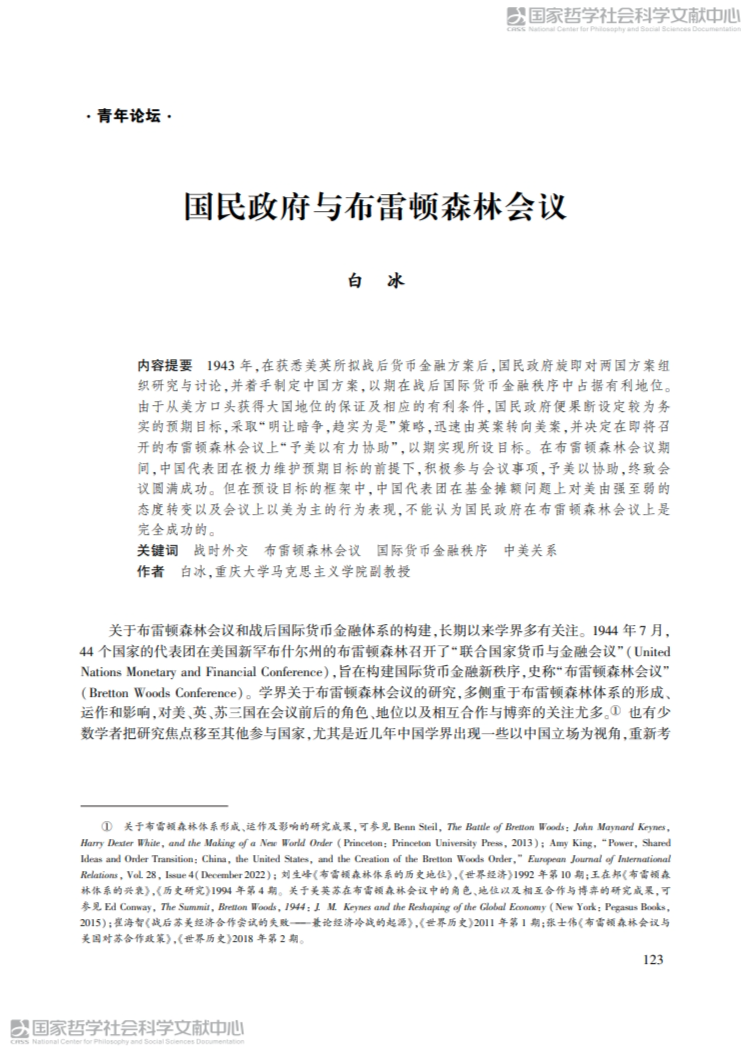 白冰副教授在CSSCI核心期刊《近代史研究》上发表论文《国民政府与布雷顿森林会议》