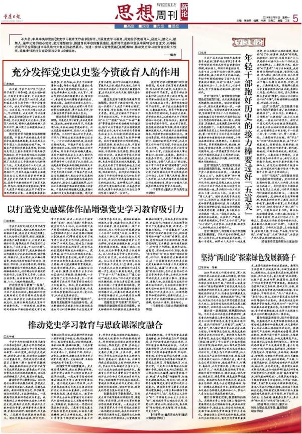 2024年3月18日,我院李旭阁博士在《重庆日报》思想周刊栏目发表《充分发挥党史以史鉴今资政育人的作用》一文。