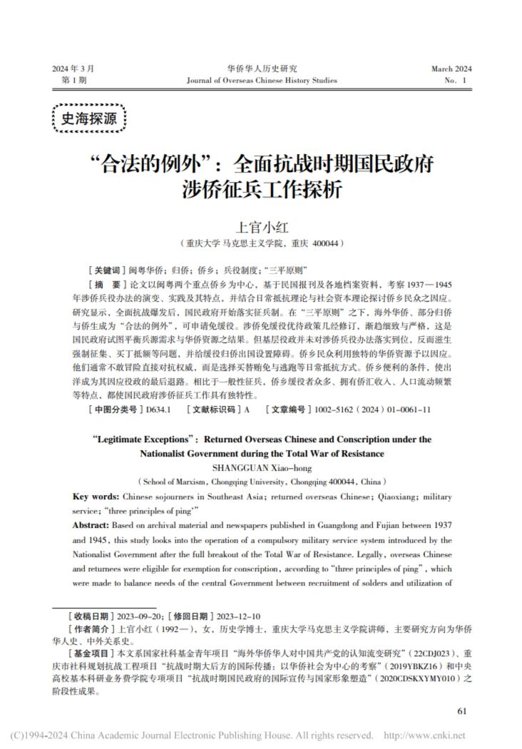 上官小红博士在CSSCI核心期刊《华侨华人历史研究》上发表论文:《“合法的例外”:全面抗战时期国民政府涉侨征兵工作探析》