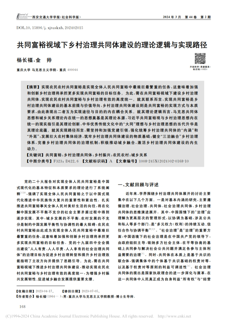 杨长福教授在CSSCI核心期刊《西安交通大学学报(社会科学版)》上发表论文:《共同富裕视域下乡村治理共同体建设的理论逻辑与实现路径》