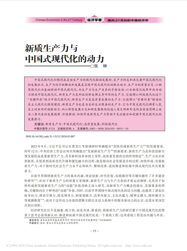 张林博士在CSSCI核心期刊《经济学家》上发表论文:《新质生产力与中国式现代化的动力》