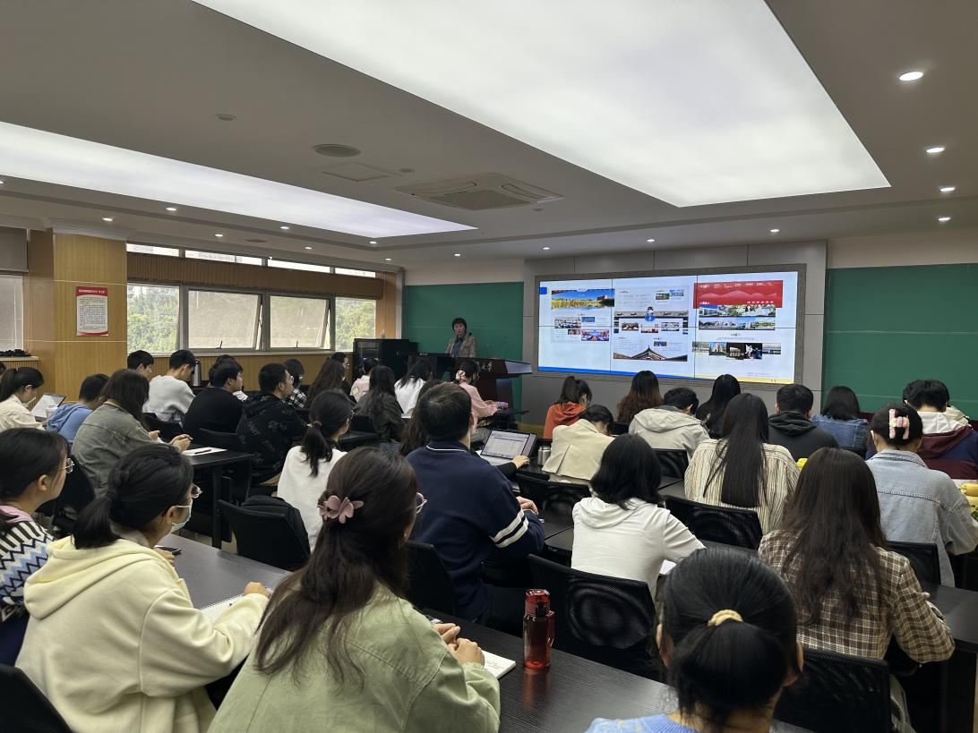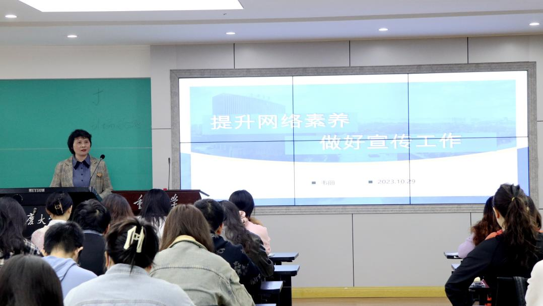 党委宣传部网络文化管理办公室副主任韦丽到学院408会议室为学院师生进行新闻宣传培训。会议由马院党委副书记、纪委书记袁利主持,班主任李家丽以及抖音短视频