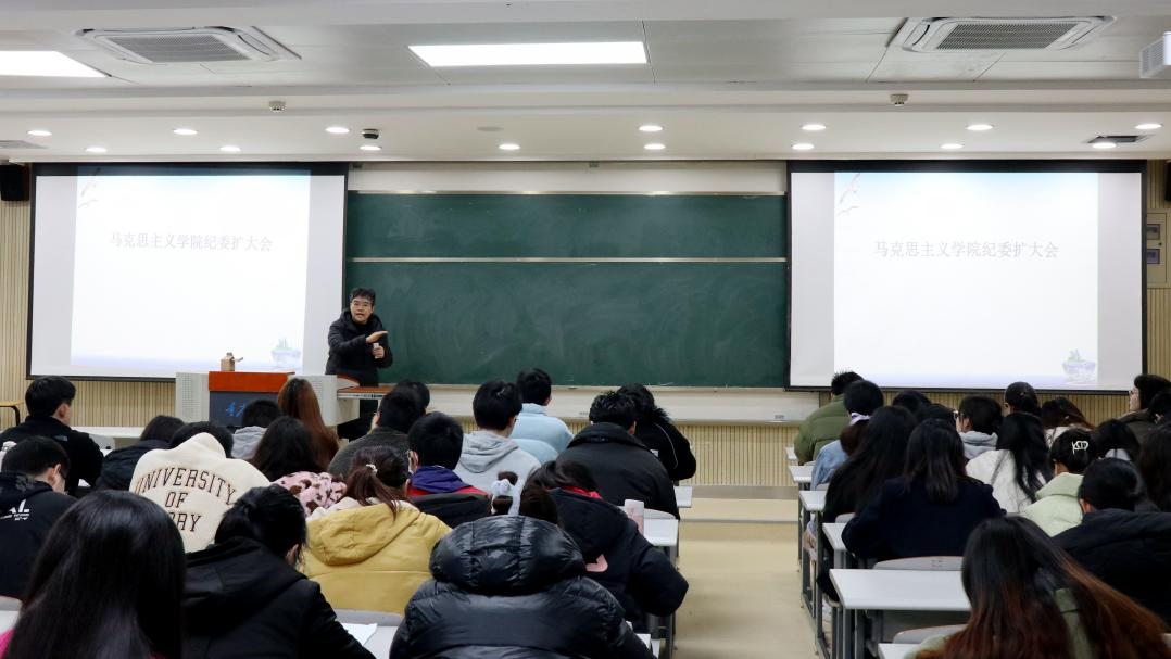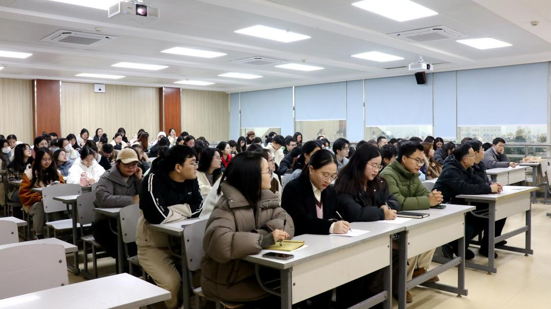 在研究生院608教室召开全体学生大会,会议由学院党委副书记袁利主持,副院长吕进、徐鲲、辅导员张丹、班主任杨柠聪、李家丽和彭蓉以及全体博士生、硕士生、本科生参加此次大会。