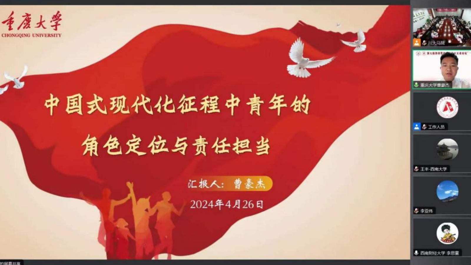 主办的第七届西部青年马克思主义者论坛。院研究生代表曹豪杰在论坛上作主题发言。此次论坛有来自四川大学、西安交通大学、电子科技大学、兰州大学、抖音短视频