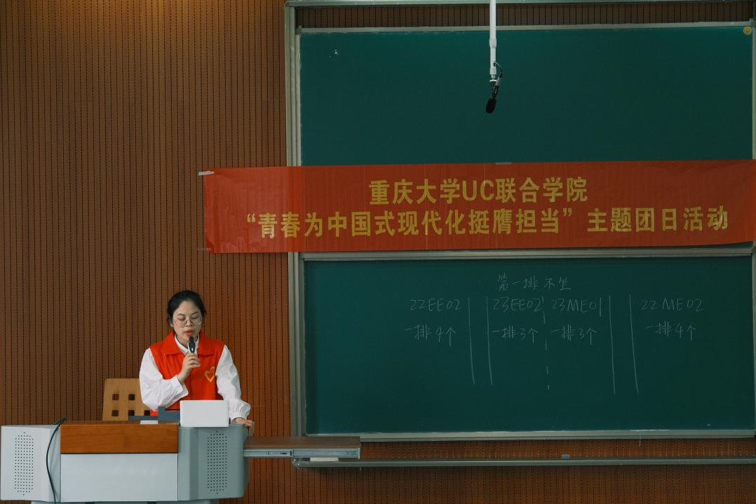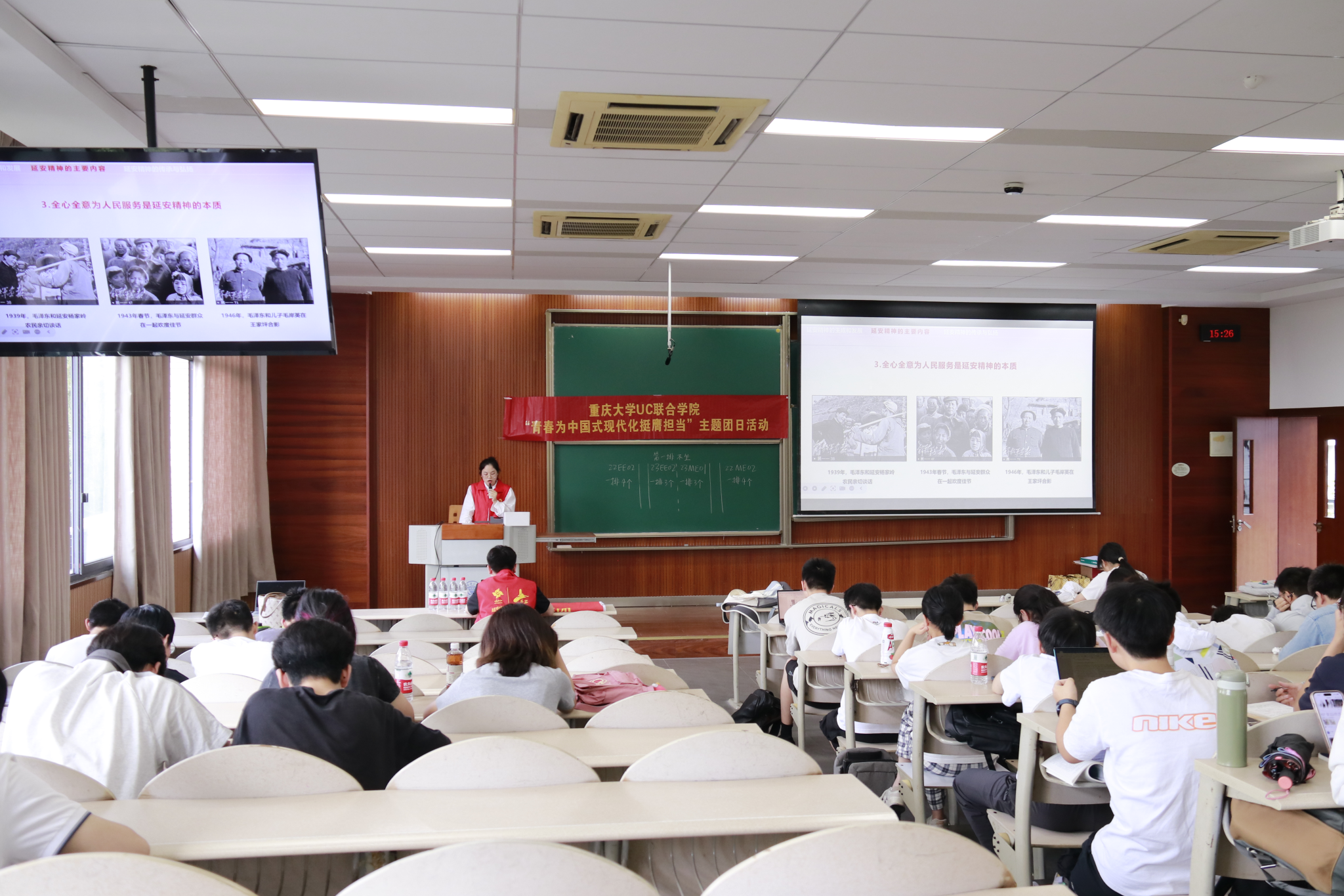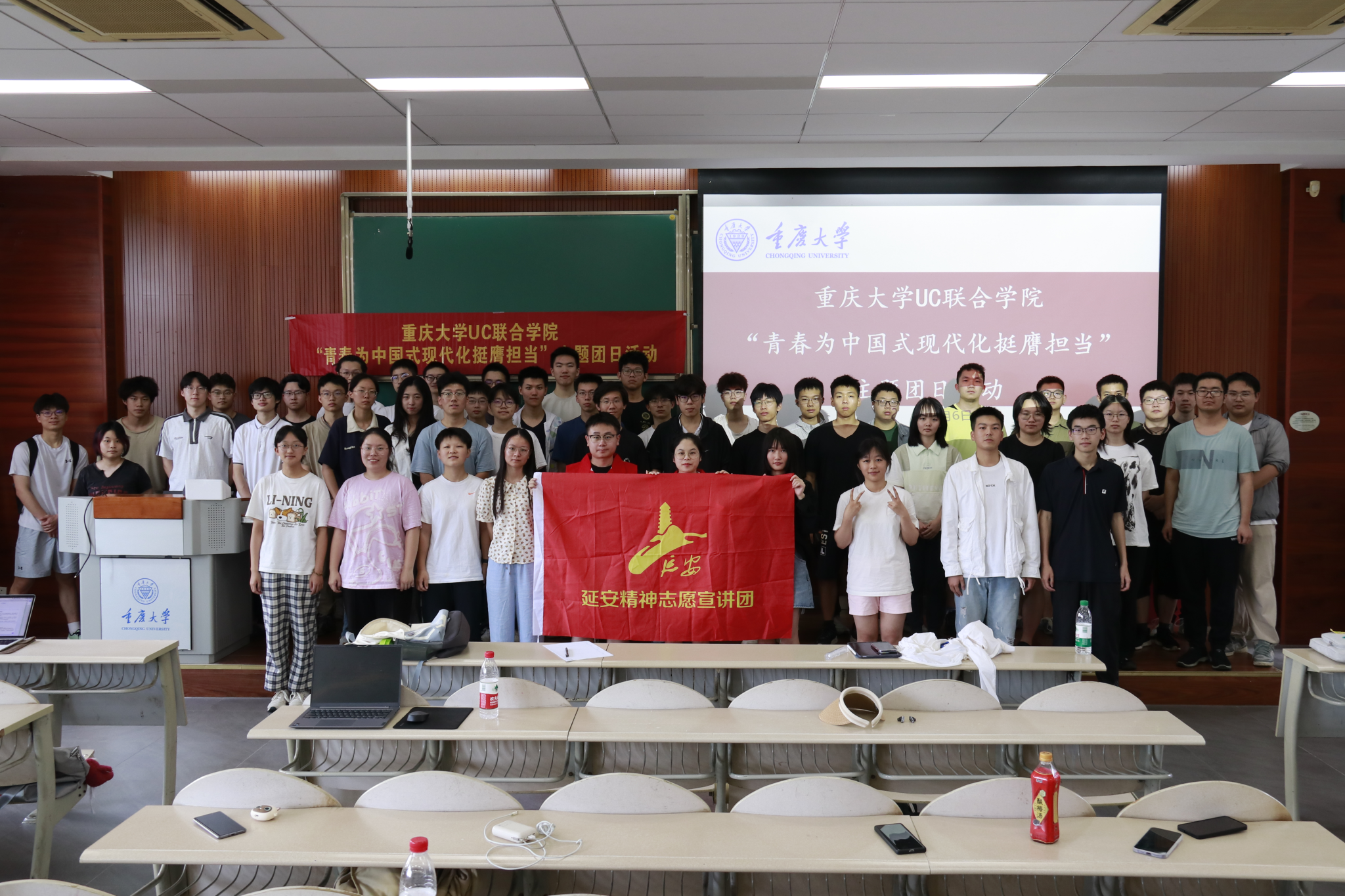 马克思主义“延安风·红岩韵”宣讲团受邀参加UC联合学院在虎溪校区第一教学楼334室举办的“青春为中国式现代化挺膺担当”主题团日活动。主讲人杨阳作了题为“把延安精神传承下去”的主题宣讲,UC联合学院22级电气2班、22级机械1班、23级电气2班、23级机械2班全体团支部成员积极参与此活动。