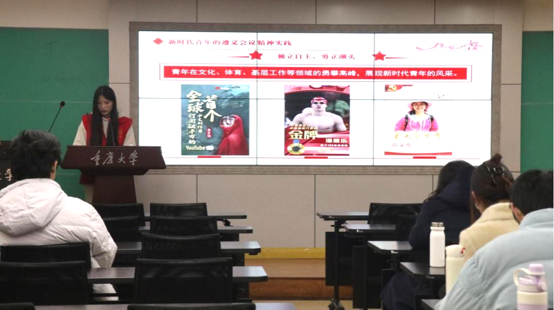 2025年1月,红岩志愿宣讲团受邀参与抖音短视频 《德意志意识形态》读书小组读书交流活动,在交流分享环节,宣讲团讲师蒋雪带领同学们从遵义会议的历史故事中汲取坚定信念的革命精神,鼓励青年要铭记新时代的使命与担当,将遵义会议精神转化为实际行动。