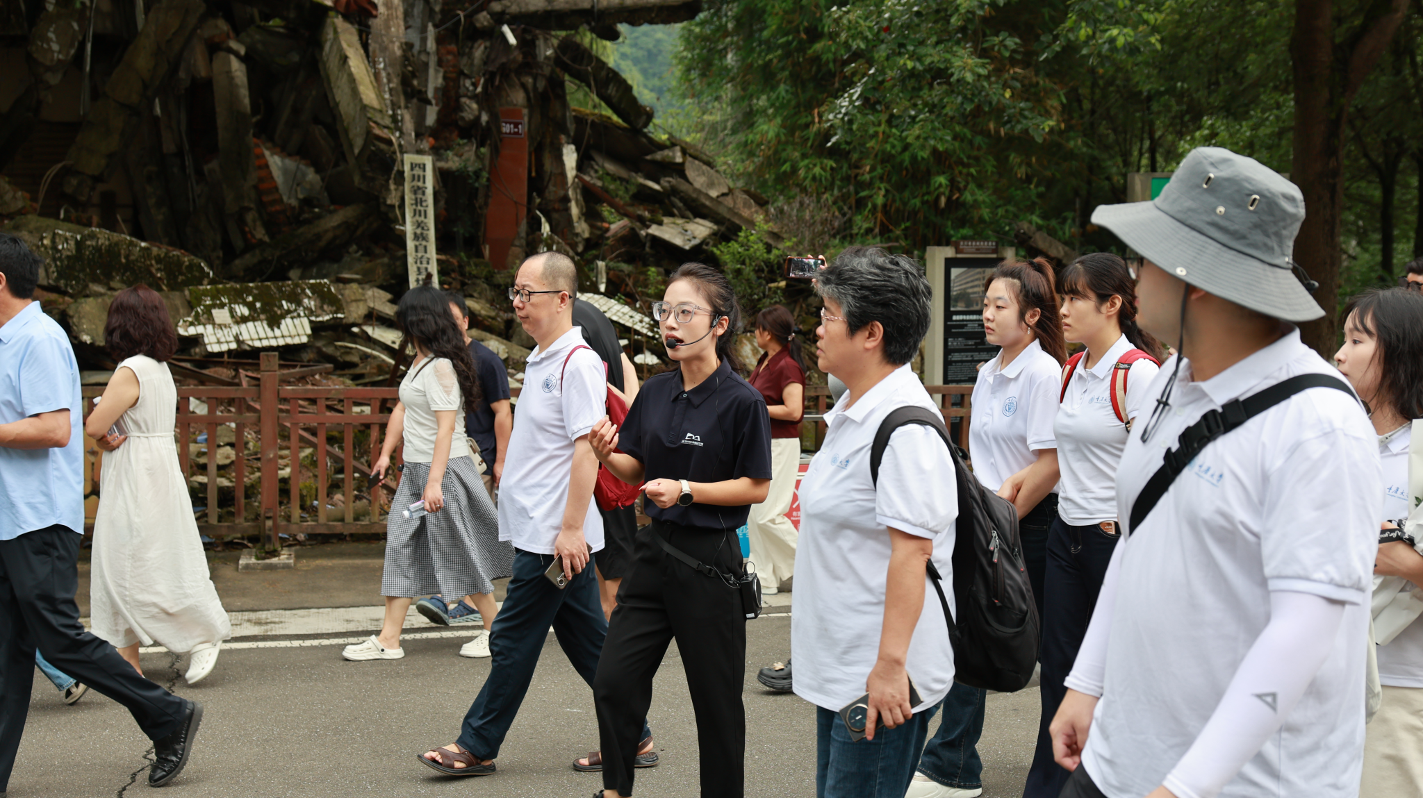 “大家现在看到的是北川老县城的中心街道,当年地震发生时,这里瞬间被夷为平地,无数生命永远定格在了那一刻......” 随着讲解员的深情讲述,团队成员们驻足凝视,眼中满是悲痛与敬意。斑驳的墙体、倾斜的建筑无声诉说着创伤,成员们眼中噙满泪水,悲痛中更添对生命的敬畏与对抗震精神的深刻感悟。