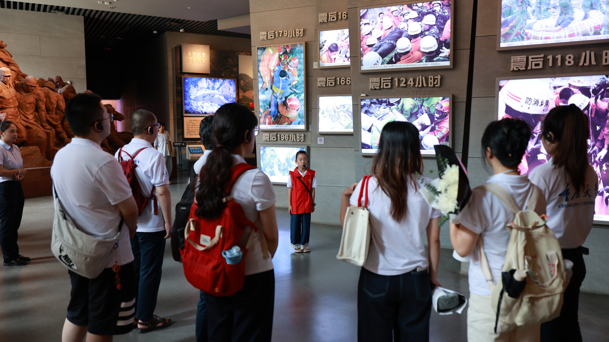地震发生时的实时监控视频、开裂的时钟、变形的汽车残骸,这让团队成员直观感受到灾难的残酷。救援人员用过的破拆工具、写满求救信息的纸板、医护人员的急救包,生动再现了当年“万众一心、众志成城”的救援场景。“看到救援队员冒着余震危险,徒手挖掘幸存者的画面,我真切体会到了‘人民至上、生命至上’的重量。”实践团成员蒋雪动情地说。
