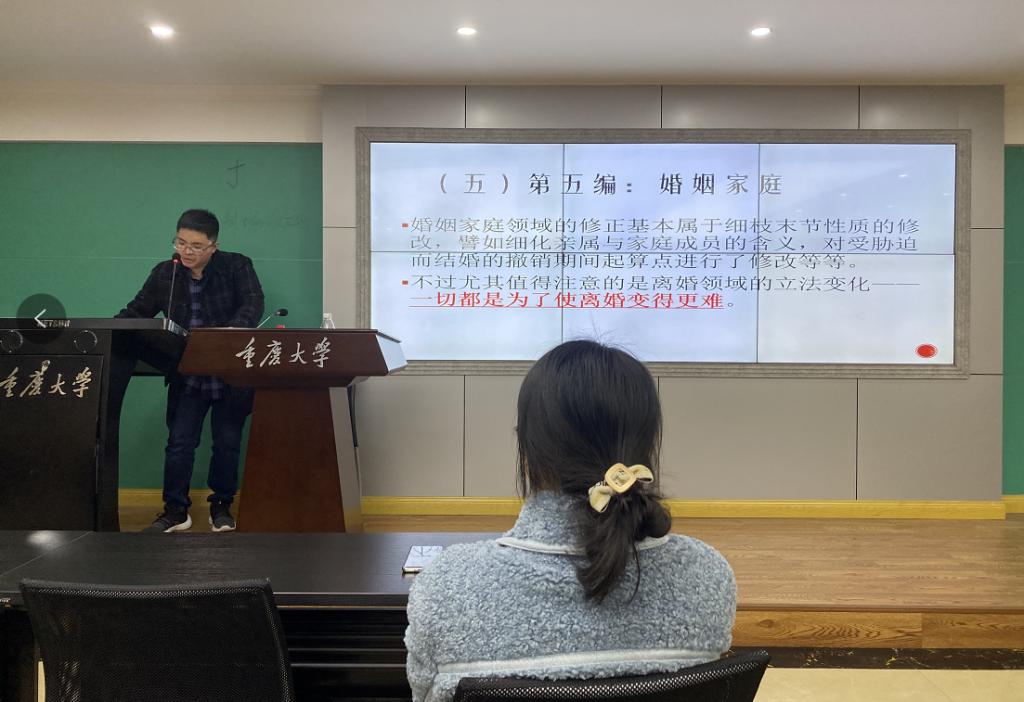 谢潇副教授从“何为法典”入题,阐释了世界立法史中法典的溯源以及演变,分析了我国《民法典》出台独特的历史意义与重大影响。随后谢老师将“我国民法典的体系构造”这一部分展开了详细的叙述,依次论述了“总则”、“物权”、“合同”、“人格权”、“婚姻家庭”、“继承”、“侵权责任”等七部分内容,向在座的师生们全方位、立体化、完整性地构建了我国《民法典》的基本框架。谢潇副教授在讲述过程中,引经据典、风趣幽默,结合中外法学家的研究经历、论争过程,列举大家日常生活中所遇到的实际法律案例,为大家带来了生动的法律一课。