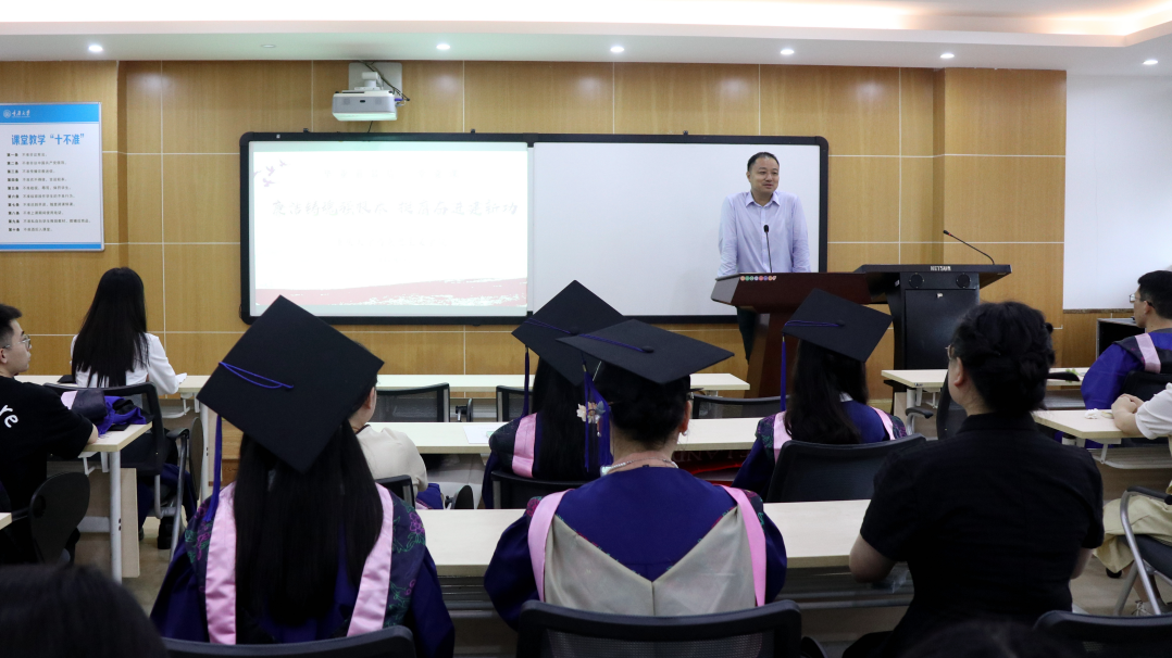 党委书记陈科在学院412室为毕业生党员讲题为“廉洁铸魂强根本,挺膺奋进建新功”主题党课,本次党课旨在进一步加强毕业生党员的党性修养、党员意识和社会责任感,坚守廉洁自律的原则,积极投身中国式现代化建设。学院党委组织员王玉琴、辅导员张丹以及全体毕业生党员参加此次活动。本次活动由研究生六支部书记胡铃英主持。