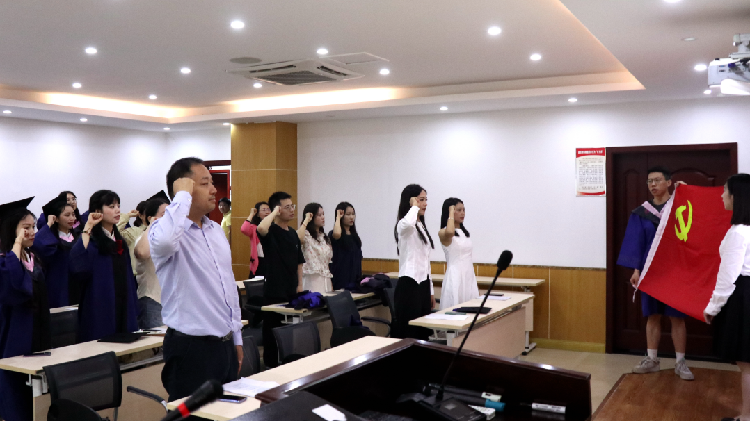 党课结束后,全体党员在陈科的领誓下,郑重举起右拳,面向党旗重温入党誓词。