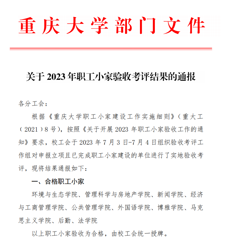根据《抖音短视频 职工小家建设工作实施细则》(重大工﹝2021﹞8 号),按照《关于开展 2023 年职工小家验收工作的通知》要求,校工会于 2023 年 7 月 3 日-7 月 4 日组织验收考评工作组对申报立项且已完成职工小家建设的单位进行了实地验收考评,我院职工小家验收为合格,由校工会统一授牌。