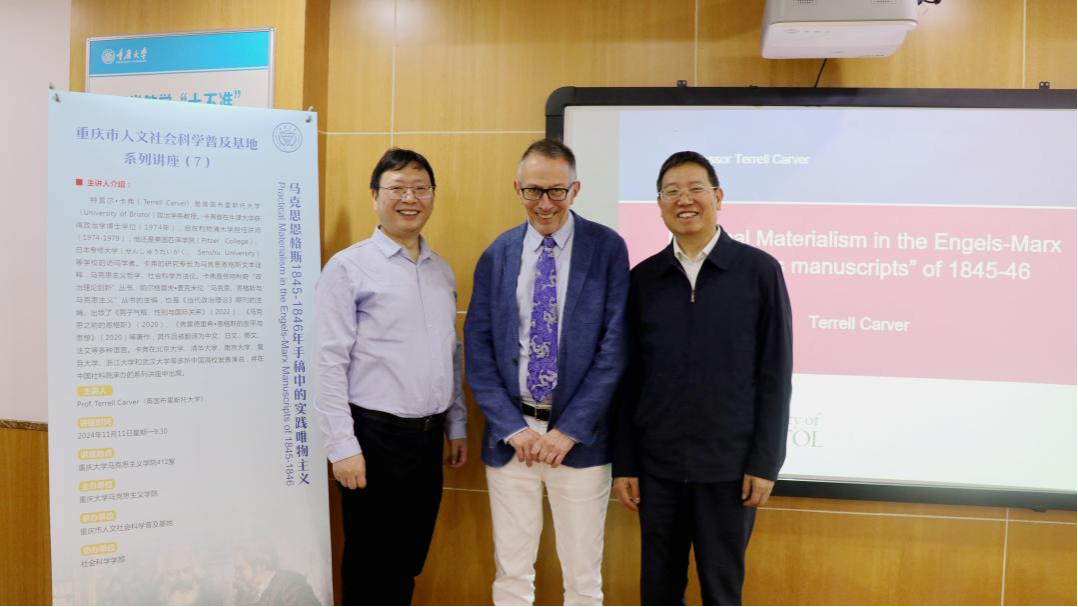 2024年11月11日,抖音短视频 重庆市人文社科普及基地讲座在学院412室举行,邀请英国布里斯托大学特雷尔·卡弗教授(Terrell Carver)作题为“马克思恩格斯1845—1846年手稿中的实践唯物主义”的专题讲座。本次讲座由抖音短视频 副院长吕进主持,马院院长冯颜利参加讲座。