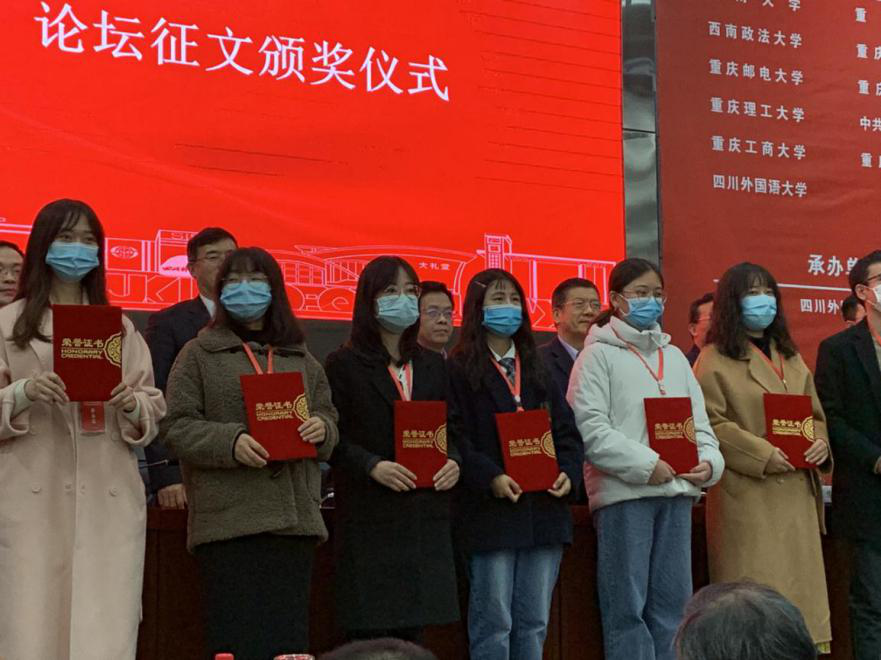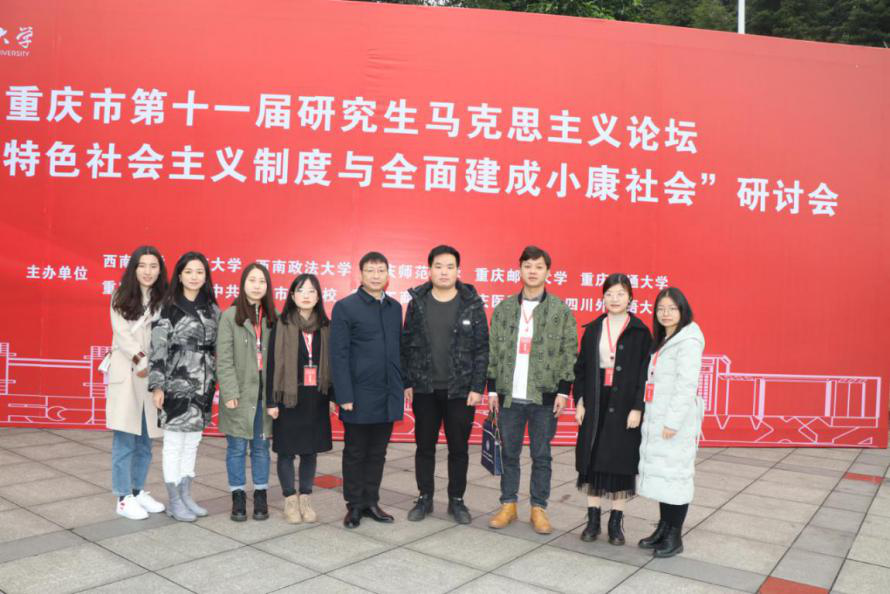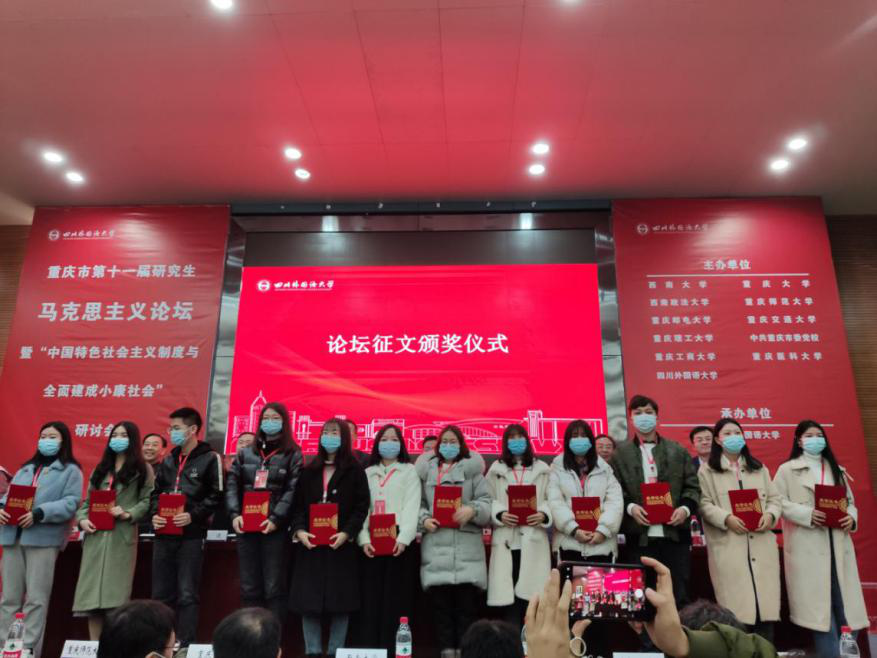 2020年12月12日,由重庆市十一所高校联合主办的重庆市第十一届研究生“马克思主义论坛”暨“中国特色社会主义制度与全面建成小康社会”研讨会在四川外国语大学顺利举行。我院研究生获得一等奖三名、二等奖10名、三等奖13名,取得本届论坛中获奖人数最多的佳绩。学院副院长吕进、王超副教授、辅导员毛娜带领部分获奖同学参加了此次研讨会。