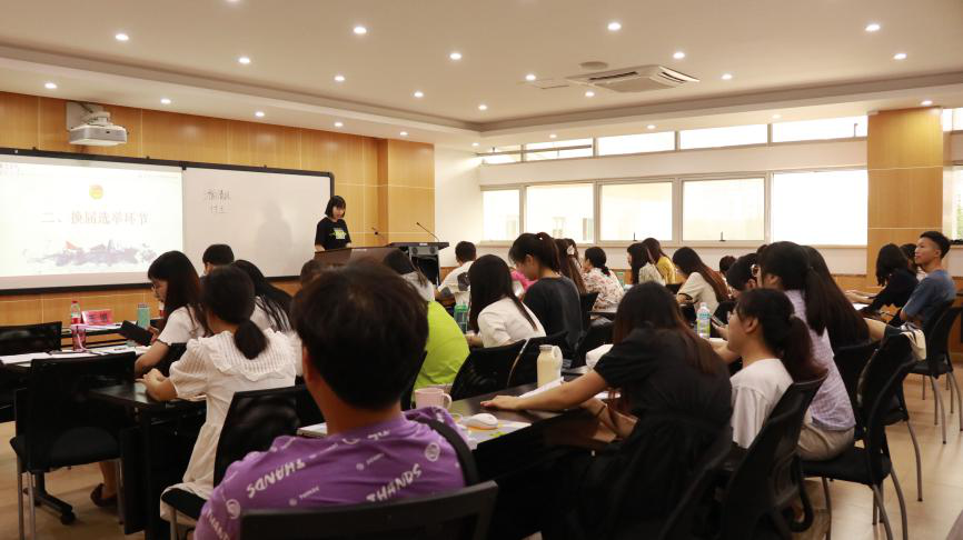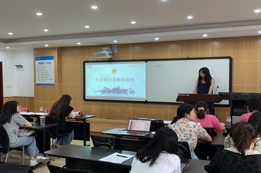 接下来,大会进行换届选举环节。高雅、李江博等二十位候选人分别上台进行竞选演讲。演讲完毕后,通过匿名投票的方式,最终选举出李江博、赵袁媛、于鑫雨、高雅、付玉、王娟六位同学成为新一届书记团、主席团成员;选拔出刘奕岑、周作玉、张馨月、杨婧、杨阳、裴瑞彤、杨清兆七位同学成为新一届部门成员;选举刘奕岑同学为新一届红岩研习会会长。