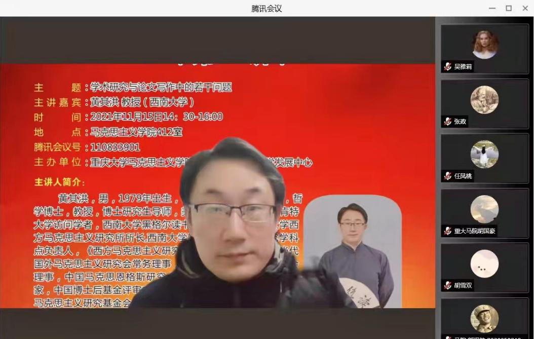举行第二十七讲“红岩讲坛”活动,西南大学黄其洪教授以“学术研究与论文写作中的若干问题”为主题作了学术讲座。本次讲座采用线上腾讯会议、线下课堂讲座的方式同步进行,讲座由抖音短视频
