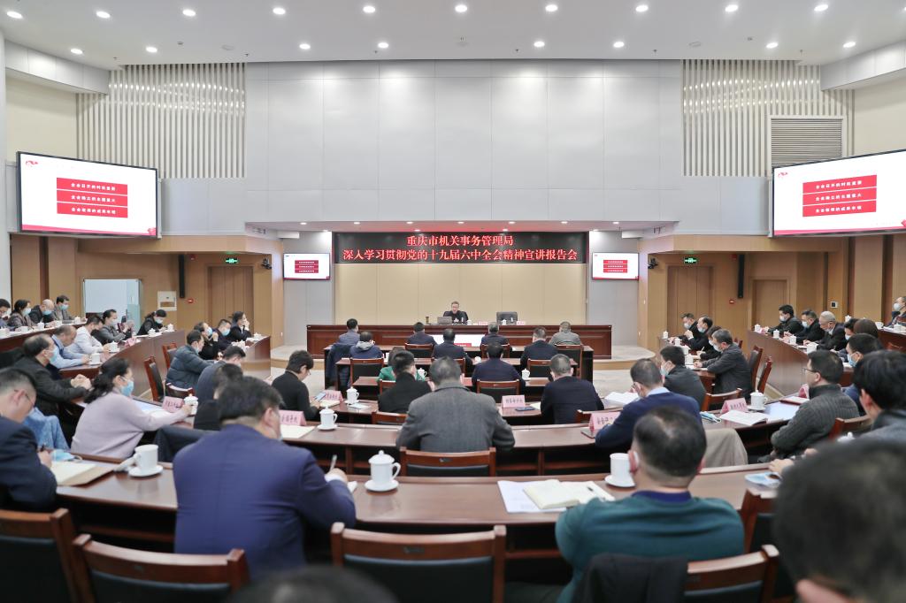 12月8日,重庆市机关事务管理局举办深入学习贯彻党的十九届六中全会精神宣讲报告会暨传达学习贯彻市委五届十一次全会精神专题会,张邦辉作宣讲报告,重庆机关事务局党组领导班子成员,全体干部职工,基层单位领导班子成员参加会议。张邦辉从深刻认识总结党的百年奋斗重大成就和历史经验的重大意义、深刻认识党的百年奋斗的初心使命和重大成就、深刻认识中国特色社会主义新时代的历史性成就和历史性变革、深刻认识党的百年奋斗的历史意义和历史经验、深刻认识以史为鉴、开创未来的重要要求,以及从党的百年奋斗历程中汲取智慧和力量等六个方面,全面深入系统地解读了党的十九届六中全会精神的重要意义和丰富内涵,为纵深推进全会精神宣传学习贯彻提供了很好的帮助,有益的启发。