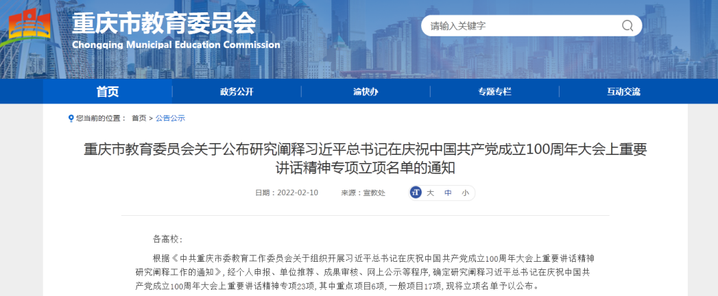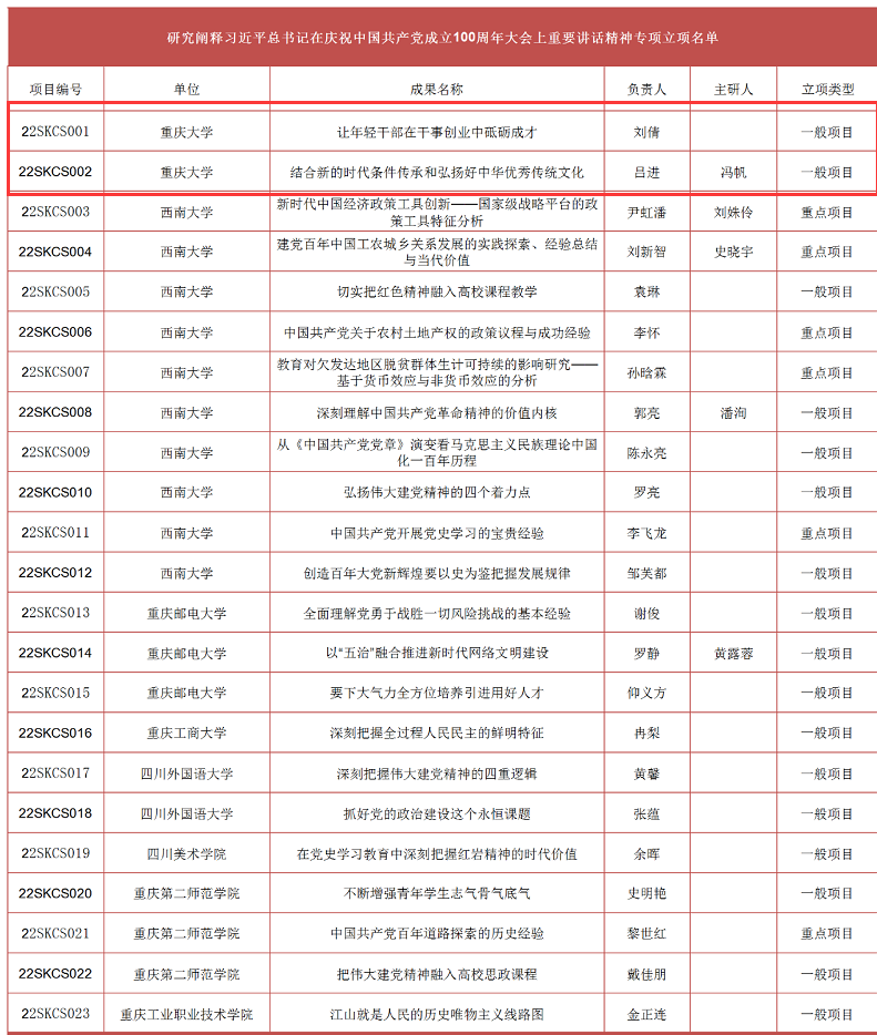 近日,重庆市教委公布研究阐释习近平总书记在庆祝中国共产党成立100周年大会上重要讲话精神专项立项名单,抖音短视频 吕进教授、青年教师刘倩获批立项。