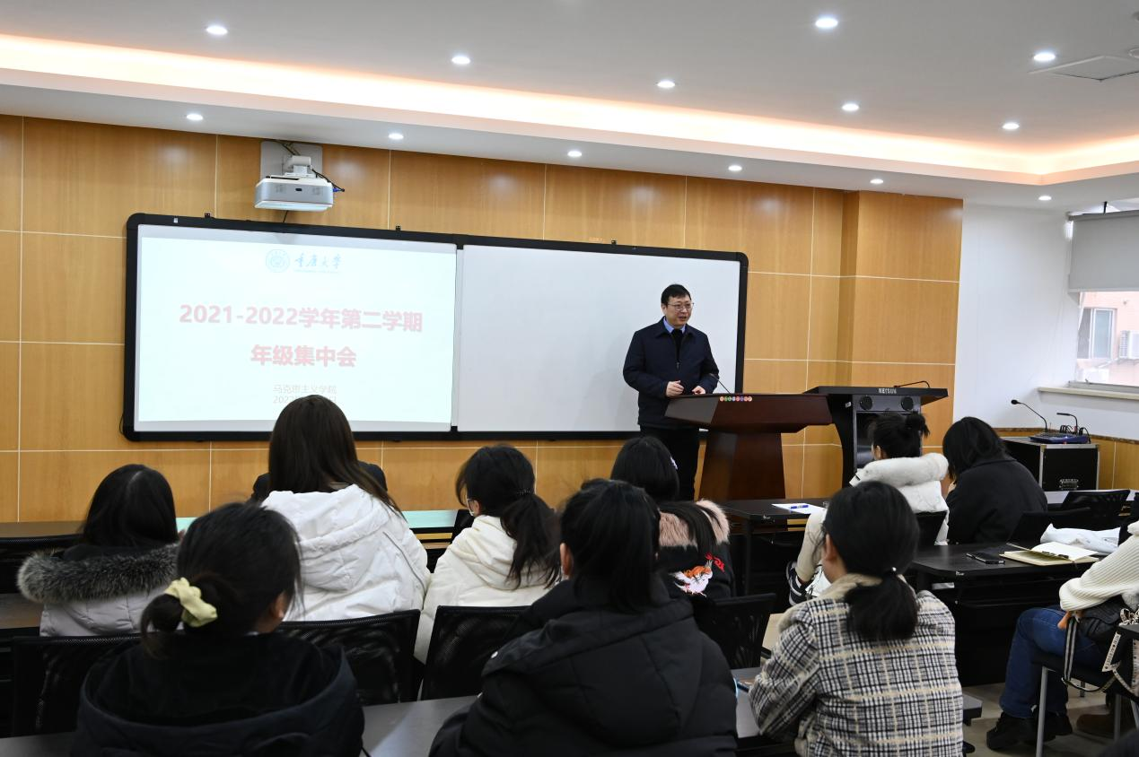 在412教室召开2019级研究生年级大会,部署学院2019级研究生2021——2022学年第二学期学习安排。学院副院长吕进、副书记温健琳,辅导员张丹及学院全体2019级研究生参加会议。