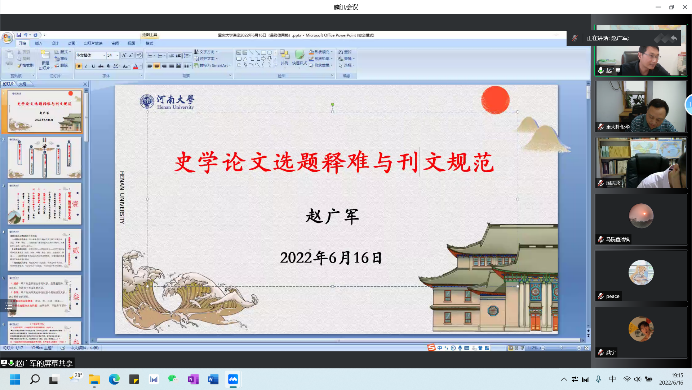 赵广军围绕“史学论文选题与刊文规范”这一中心展开讲解。首先,他从“编辑部的故事:编辑的多重人格”入题,围绕“如何写出编辑喜欢的文章”这一中心展开讲解。接下来,他指出学术论文写作选题应当避免的三大不良倾向,第一,选题时要避免高度同质化倾向,应当通过大量的阅读、借鉴来构建自己的文章框架,从内容、研究思路和结论观点三方面寻求突破;第二,避免选题碎片化倾向,赵广军从个案化稿件与理论泛化稿件的关系入手,指出史学研究碎片化现象无法消除,但作为期刊可以改变,并说明了要以“小处着手,大处立脚”的方法来解决个案化现象;第三,避免研究内容空泛化倾向,他强调,史学论文以述为主,以论提升,应当避免“浅析”“浅论”“刍议”等表述。在行文规范方面,赵广军对标题、摘要、关键词、绪论、框架结构这五个论文主要部分展开详细论述,他认为标题是最亮眼的,摘要是最精彩的,框架结构是否自洽是一篇好论文的关键。