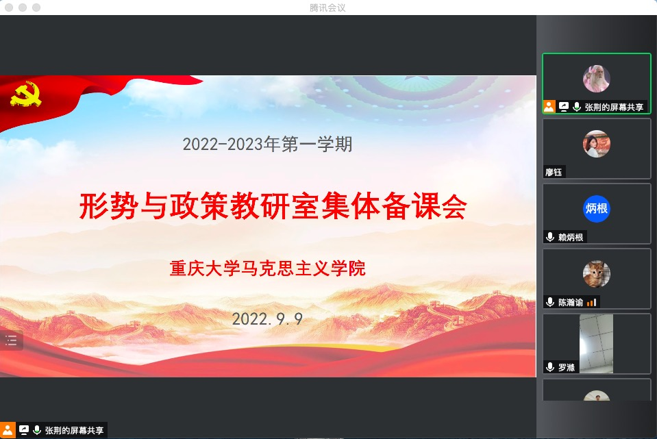 2022年9月9日下午,学院形势与政策教研室在“腾讯会议”平台召开2022-2023年第一学期第一次集体备课会。学院党委书记罗滌、副院长徐鲲、副书记温健琳以及形势与政策教研室全体教师参加了此次会议,会议由形势与政策教研室主任张荆主持。