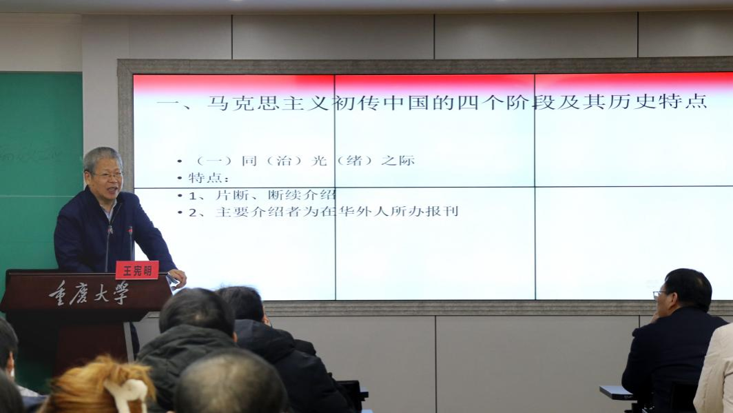 王宪明教授作题为“马克思主义初传中国及其与中国优秀传统文化的初步结合”的学术讲座。我院党委书记陈科、副院长徐鲲、吕进及学院师生参加讲座。