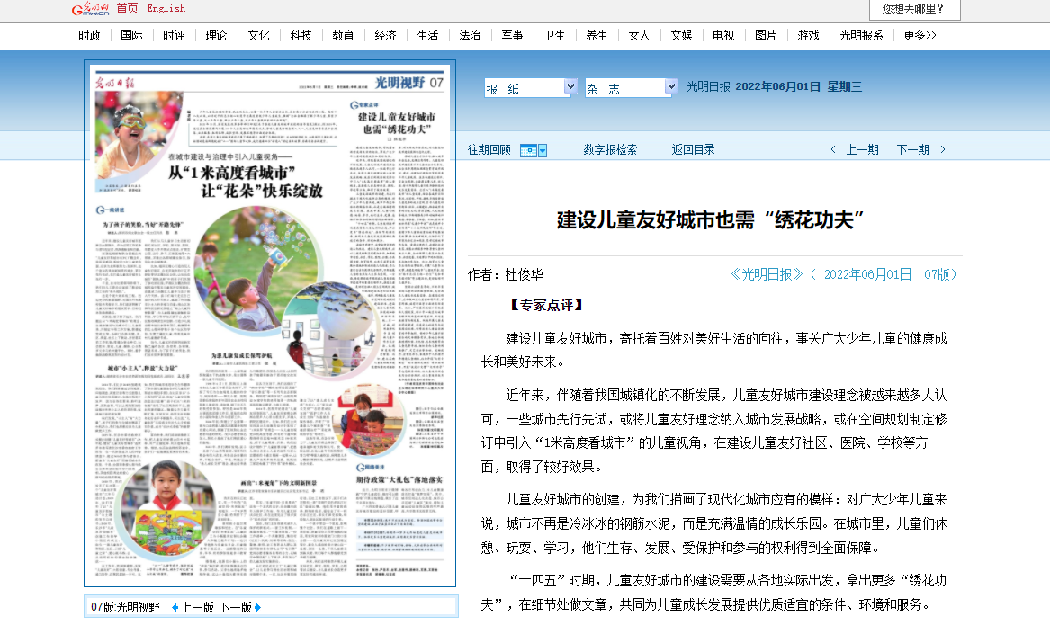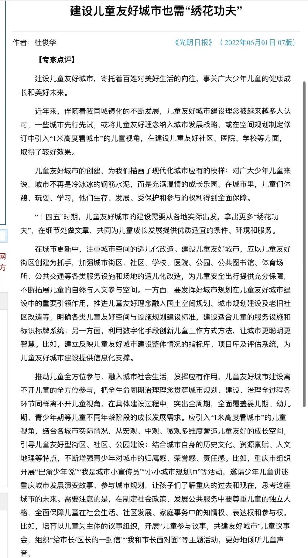 杜俊华教授在6月1日出版的《光明日报》发表专家点评理论文章《建设儿童友好城市需要有“绣花功夫”》。
