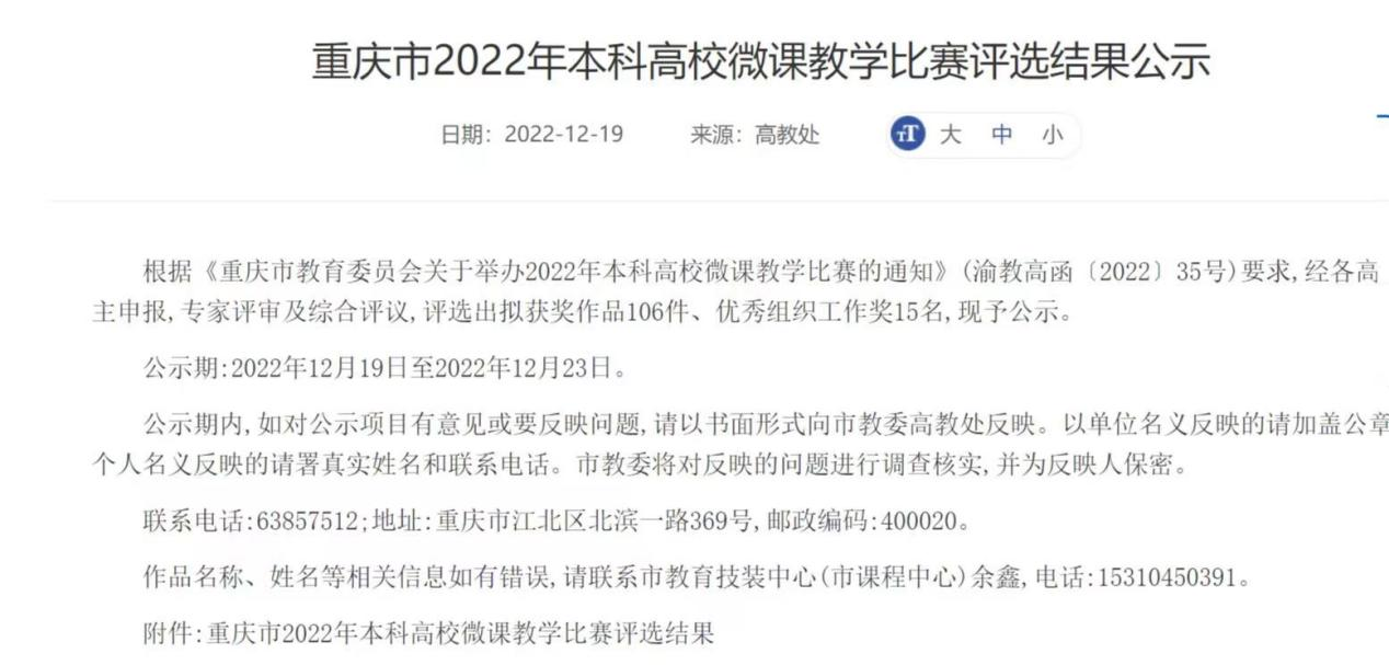 2022年12月19日,重庆市2022本科高校微课教学比赛评选结果公示,抖音短视频 魏强教授荣获二等奖。获奖信息如下: