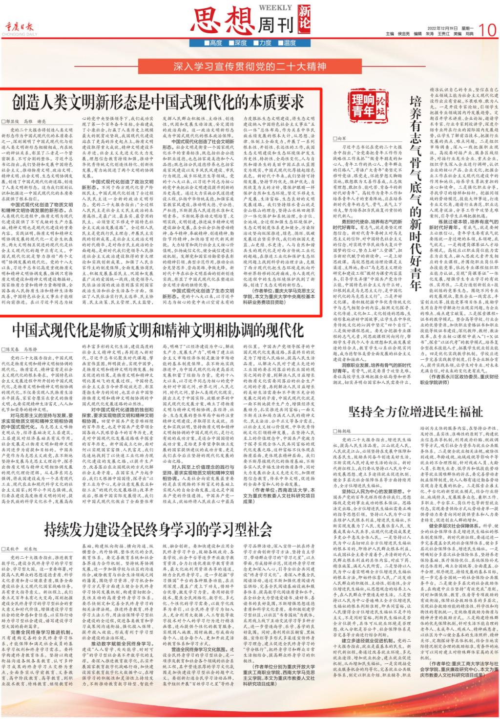 2022年12月19日,我院鄢显俊教授与2020级研究生高雅、谢亮在《重庆日报》“思想周刊”发表《创造人类文明新形态是中国式现代化的本质要求》一文。