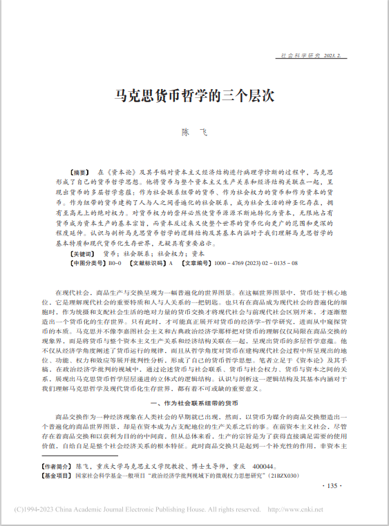 陈飞教授在《社会科学研究》上发表论文《马克思货币哲学的三个层次》