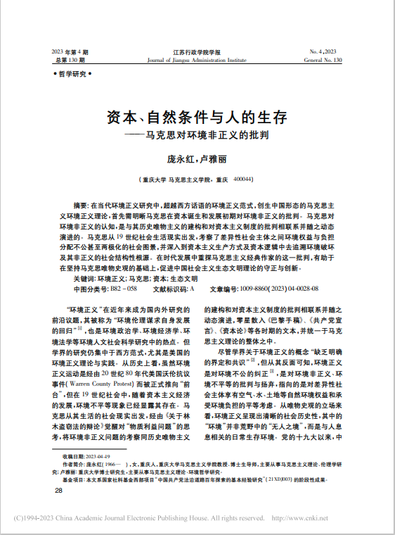 庞永红教授在《江苏行政学院学报》上发表论文《资本、自然条件与人的生存——马克思对环境非正义的批判》