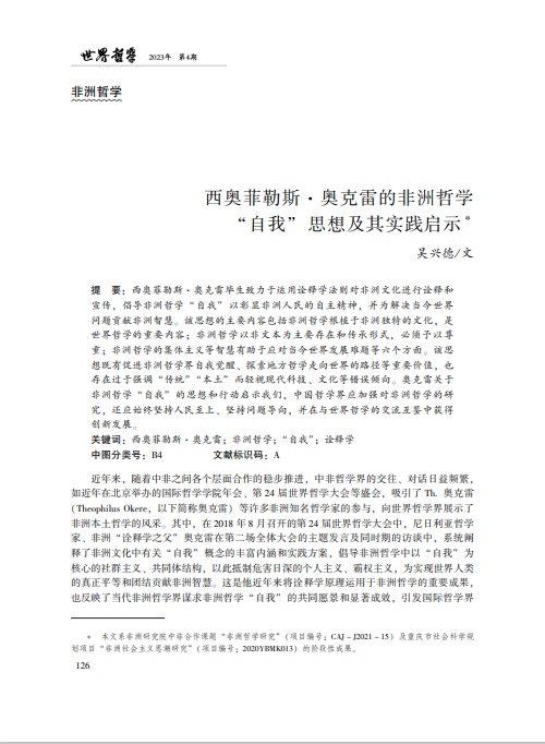 吴兴德副教授在《世界哲学》上发表论文《西奥菲勒斯·奥克雷的非洲哲学“自我”思想及其实践启示》