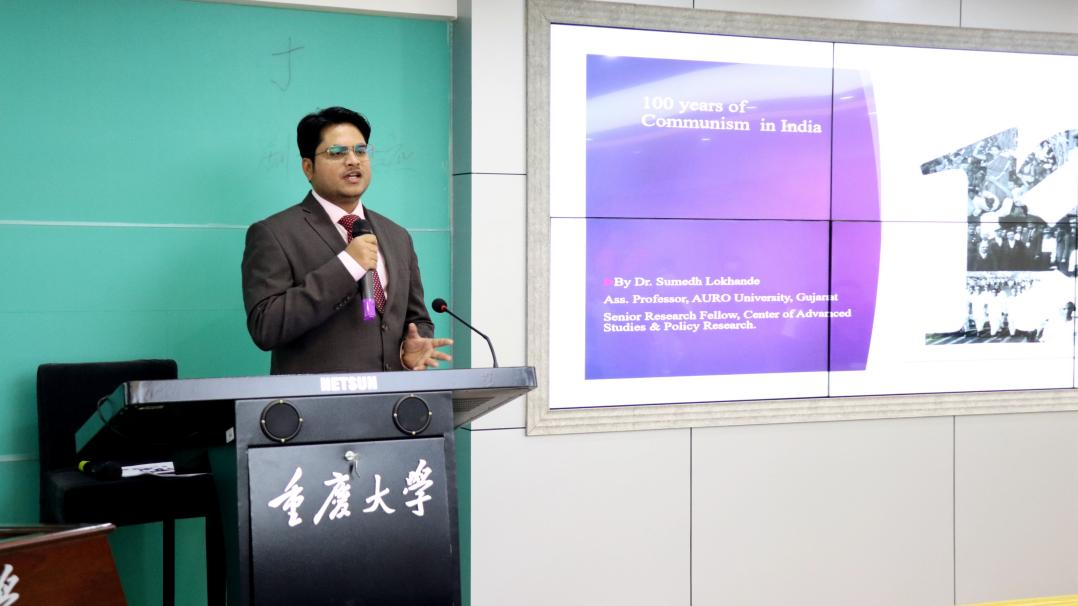 “红岩讲坛”第三十八讲在学院408室举行,印度奥罗大学Sumedh Ail Lokhande(聪利)副教授做客本次讲坛,作了题为“印度共产主义的源与流”的专题讲座。我院党委副书记袁利、副院长徐鲲、青年教师杨柠聪、陈瀚谕以及各年级研究生参加此次讲座,讲座由徐鲲主持。