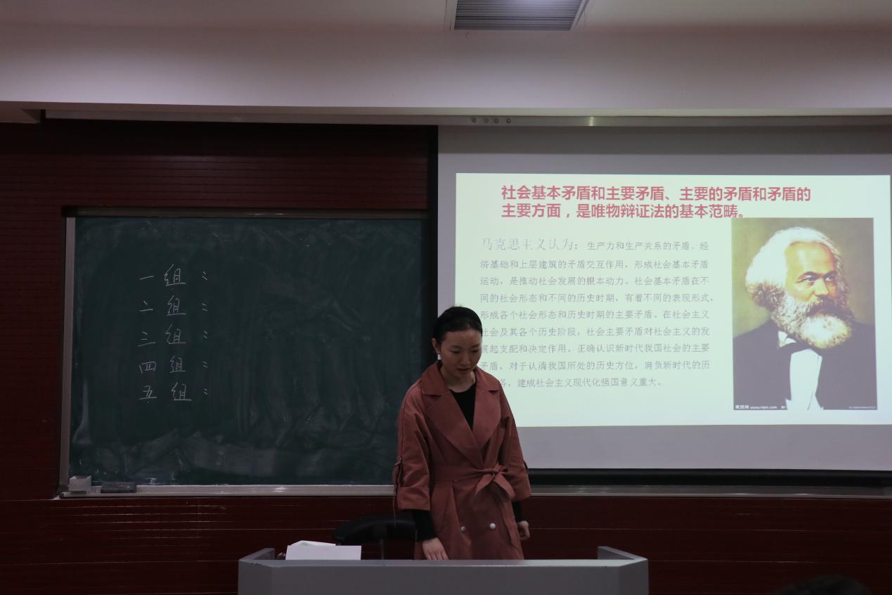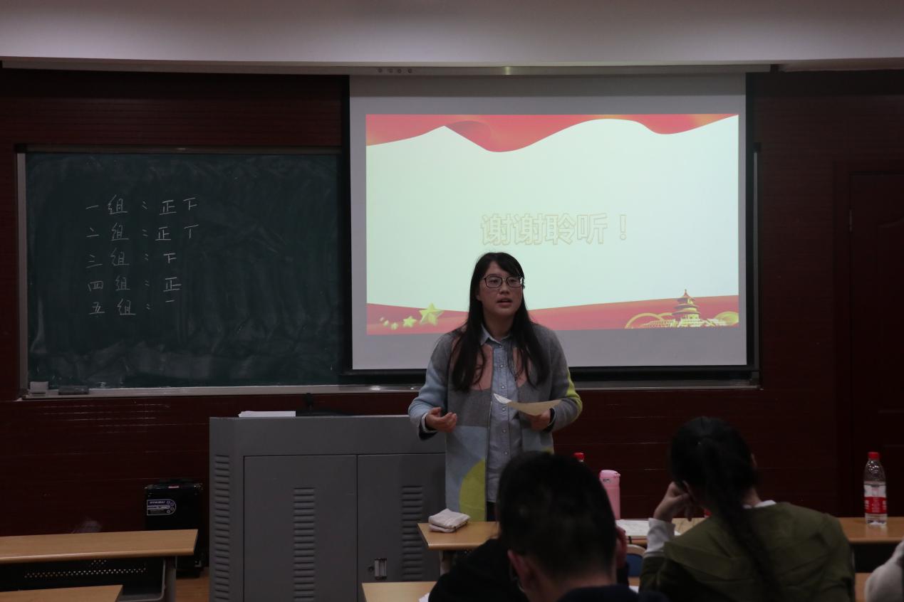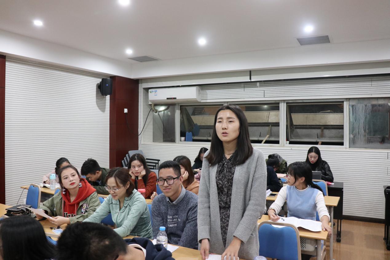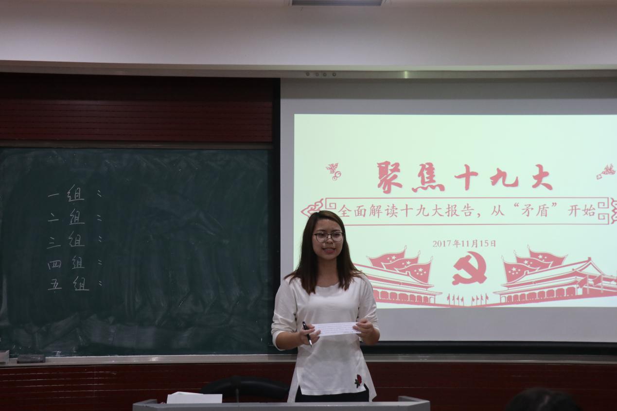 此次读书活动以小组为单位,由每小组代表分别作分享并提出问题与大家一起讨论。第一组从哲学基本矛盾出发,以“与时迁移,应物变化”为主题探讨了我国社会主要矛盾的变化,分别从黑格尔、马克思、列宁、毛泽东、邓小平等经典作家的角度阐明了主要矛盾的变化实质,即中国在变,变的是方法,不变的是“初心”。第二组主要对“美好生活需要”和“不平衡不充分”进行解读,探讨两者间的关系,并指出在继续推动发展的基础上,我们要更加注重发展与人民美好生活需要相适应,更加注重发展提供更高水平更高质量的供给,更加注重发展的均衡性,更好推动人的全面发展和社会全面进步。第三组则从认识主要矛盾、把握主要矛盾的科学内涵、积极应对主要矛盾的新挑战三个方面向大家诠释了新时代的矛盾变化。第四组杜琛同学结合《矛盾论》和《实践论》对新矛盾进行了深入解读,她认为,新时代我国社会主要矛盾的历史性变化,需要我们从时代背景、科学内涵和划时代意义等方面深刻认识、深入领会。第五组谭小霞同学则从主要矛盾和矛盾的主要方面阐释了新时代中国社会主要矛盾历史性转化的理论依据,她强调我们应该满足广大人民群众的要求,以解决主要矛盾为发力点,推动中华民族伟大复兴。此外,同学们不仅积极参与每个小组的提问环节的讨论,而且也踊跃发表自己的见解,读书会现场闪耀着思辨的火花。