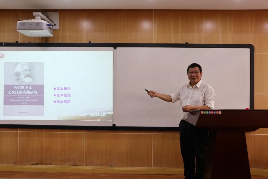 石加友以“马克思主义大众化的实践研究”为逻辑起点,围绕马克思主义大众化的基本概念、基本原理、基本路线三个方面展开讲座。首先,石教授从内涵和外延两个维度厘清了“马克思主义”“大众化”“马克思主义大众化”等马克思主义理论问题域的关键概念。接着,他从现象与本质、内因与外因、内容与形式这几对辩证关系中,逐一论证了马克思主义大众化的基本原理。最后,他从理论研究、顶层设计、实践探索三个层面阐释了马克思主义大众化的基本路线。同时,他强调,只有通过创新工作思路、明确工作职责、健全工作机制才能做好实践探索工作,让马克思主义大众化不仅仅停留在纸上,更多的展现在实践中。